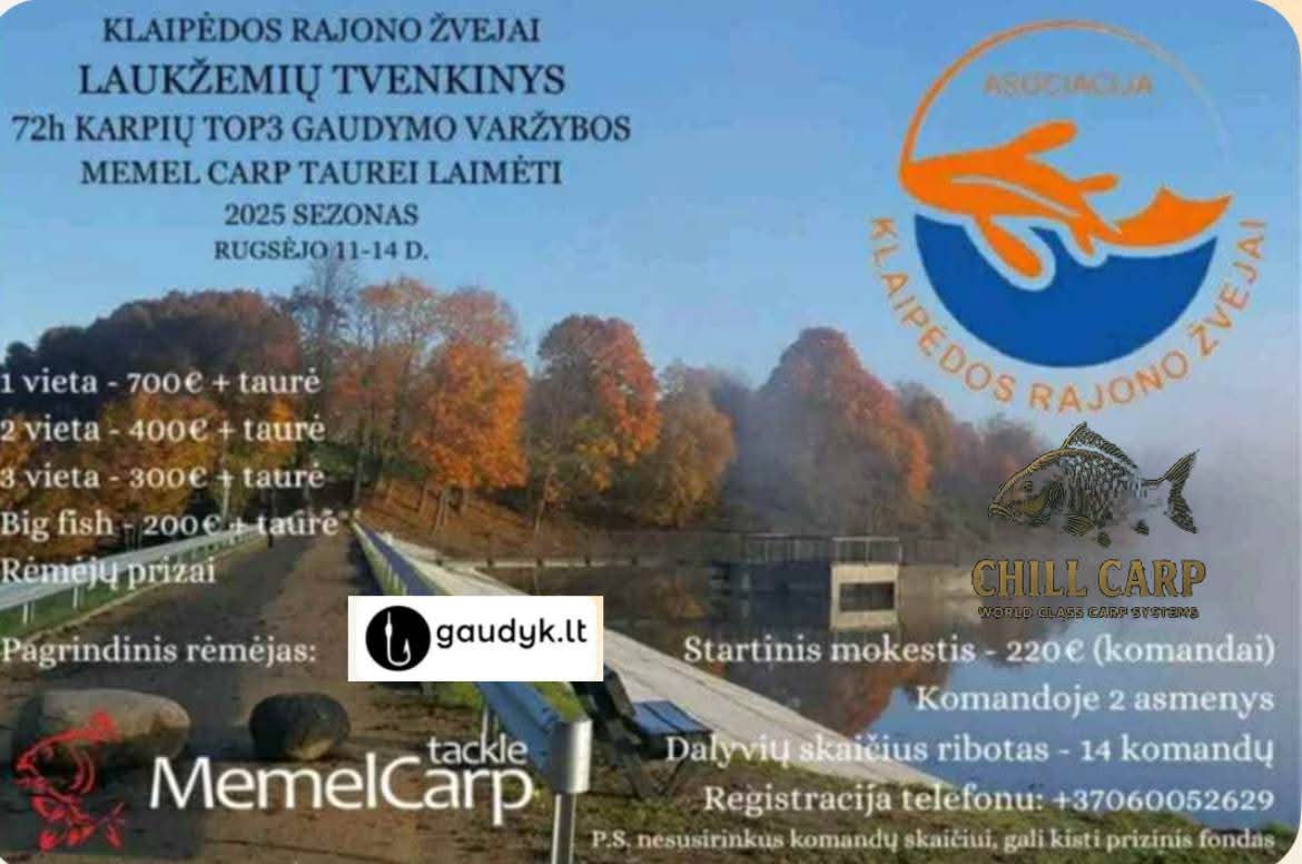 KLAIPĖDOS RAJONO ŽVEJAILAUKŽEMIŲ TVENKINYS2025 SEZONO 72h KARPIŲ TOP3 GAUDYMO VARŽYBOS MEMEL CARP TAUREI LAIMĖTIRUGSĖJO 11-14 DIENOMIS